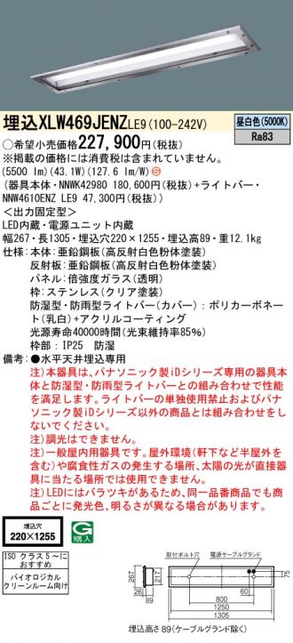バイオロジカルクリーンルーム向け 天井埋込型 40形 一体型LEDベースライト ステンレス製 防噴流型 パネル付型(NNWK42980+NNW4610ENZLE9)(iDシリーズ)