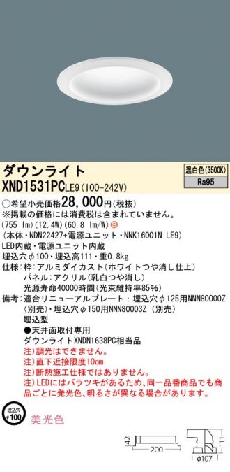 天井埋込型 LED(温白色) ダウンライト 美光色・拡散タイプ 埋込穴φ100 パネル付型 コンパクト形蛍光灯FHT32形1灯器具相当 LED 150形(NDN22427+NNK16001NLE9)