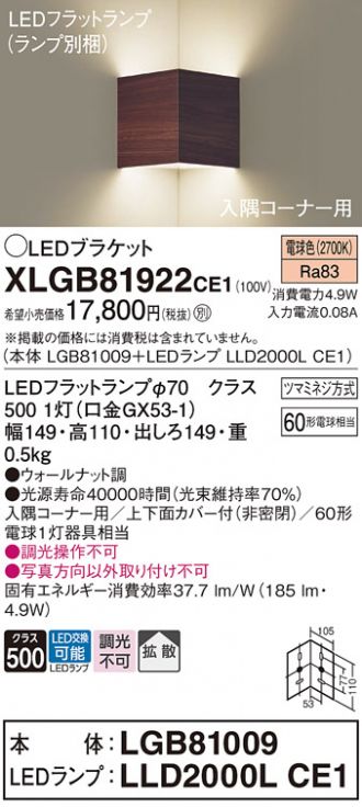 壁直付型 LED(電球色) 入隅コーナー用ブラケット 拡散タイプ 白熱電球60形1灯器具相当(LGB81009+LLD2000LCE1)