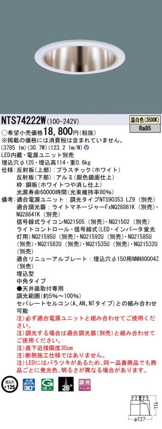 天井埋込型 LED(温白色) ダウンライト ビーム角28度・中角タイプ・光源遮光角30度 調光タイプ(ライコン別売)/埋込穴φ125 CDM-R70形1灯器具相当 LED 350形