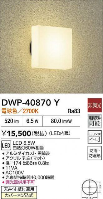 TOP > トイレ・浴室・洗面所(大光電機) > DWP-40870Y商品詳細