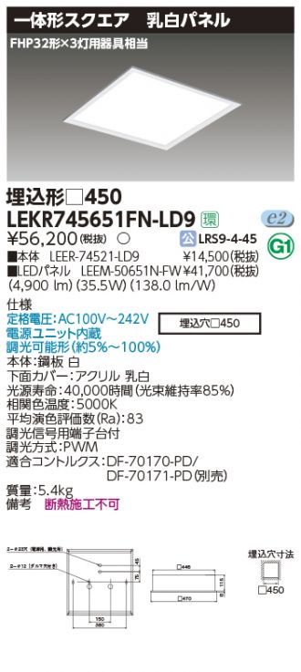 ベースライト埋込□450乳白(LEER-74521-LD9+LEEM-50651N-FW)