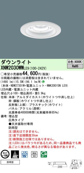 天井埋込型 LED(白色) ダウンライト 浅型10H・ビーム角45度・広角タイプ・光源遮光角15度 防雨型/埋込穴φ100 パネル付型 コンパクト形蛍光灯FHT42形1灯器具相当 LED 200形(NDW27301W+NNK20015NLE9)