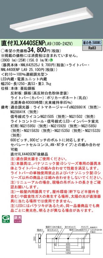 天井直付型 40形 一体型LEDベースライト 連続調光型・調光タイプ(ライコン別売) スリムベース 直管形蛍光灯FLR40形2灯器具相当 FLR40形・4000 lm(節電)(NNLK42525J+NNL4400ENPLA9)