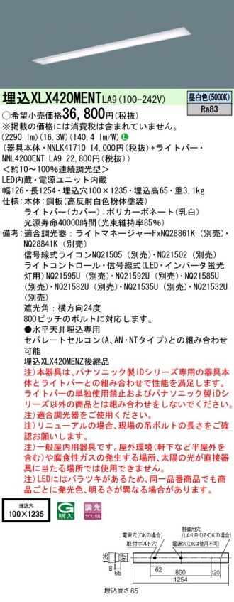 天井埋込型 40形 一体型LEDベースライト 連続調光型・調光タイプ(ライコン別売) コンフォート/下面開放型 Hf蛍光灯32形定格出力型1灯器具相当 Hf32形定格出力型・2500 lm(NNLK41710+NNL4200ENTLA9)