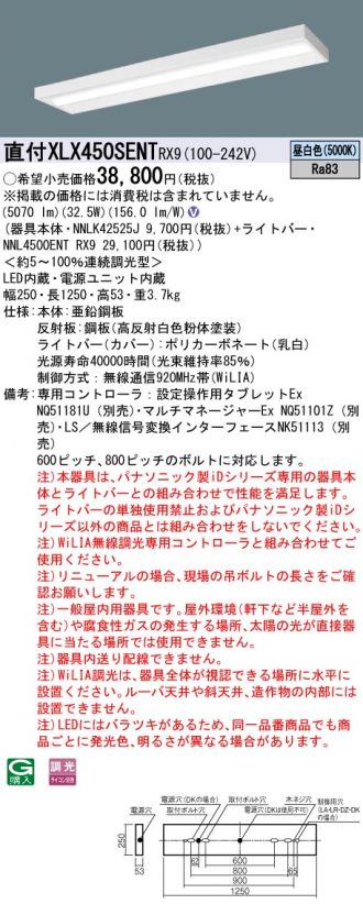 天井直付型 40形 一体型LEDベースライト 連続調光型・調光タイプ(ライコン別売) スリムベース Hf蛍光灯32形定格出力型2灯器具相当/Hf蛍光灯63形定格出力型1灯器具相当 Hf32形定格出力型/Hf63形定格出力型・5200 lm(NNLK42525J+NNL4500ENTRX9)