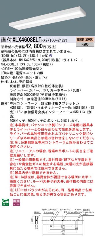 【代金引換不可】天井直付型 40形 一体型LEDベースライト 連続調光型・調光タイプ(ライコン別売) スリムベース Hf蛍光灯32形高出力型2灯器具相当 Hf32形高出力型・6900 lm(NNLK42525J+NNL4600ELTRX9)