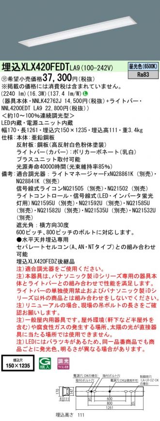 【代金引換不可】天井埋込型 40形 一体型LEDベースライト 連続調光型・調光タイプ(ライコン別売) フリーコンフォート/基本灯具 Hf蛍光灯32形定格出力型1灯器具相当 Hf32形定格出力型・2500 lm(NNLK42762J+NNL4200EDTLA9)