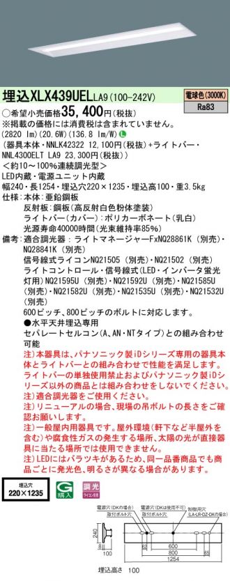 リニューアル用 天井埋込型 40形 一体型LEDベースライト 連続調光型・調光タイプ(ライコン別売) 下面開放型 Hf蛍光灯32形高出力型1灯器具相当 Hf32形高出力型・3200 lm(NNLK42322+NNL4300ELTLA9)