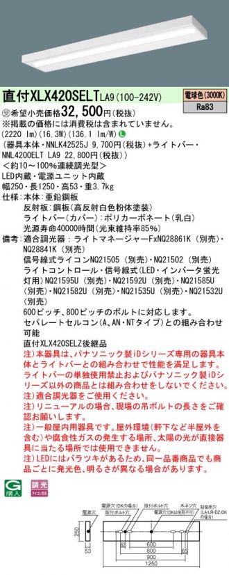 【代金引換不可】天井直付型 40形 一体型LEDベースライト 連続調光型・調光タイプ(ライコン別売) スリムベース Hf蛍光灯32形定格出力型1灯器具相当 Hf32形定格出力型・2500 lm(NNLK42525J+NNL4200ELTLA9)