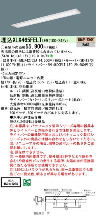 天井埋込型 40形 一体型LEDベースライト マルチコンフォート/フリーコンフォート Hf蛍光灯32形高出力型2灯器具相当 Hf32形高出力型・6900 lm(NNLK42762J+FSK41270F+NNL4600ELTLE9)