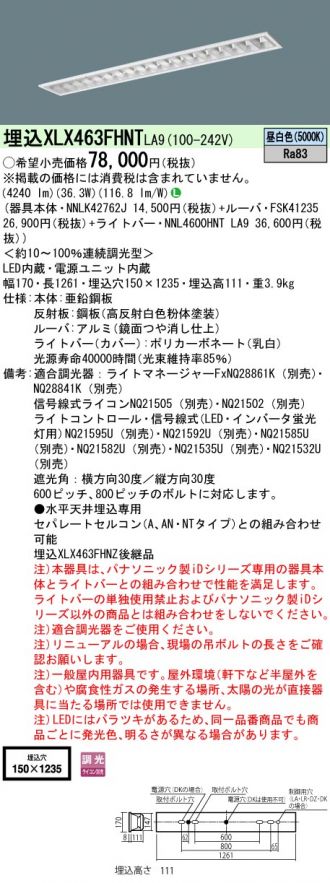 天井埋込型 40形 一体型LEDベースライト アルミルーバ 連続調光型・調光タイプ(ライコン別売) フリーコンフォート Hf蛍光灯32形高出力型2灯器具相当 Hf32形高出力型・6900 lm(NNLK42762J+FSK41235+NNL4600HNTLA9)