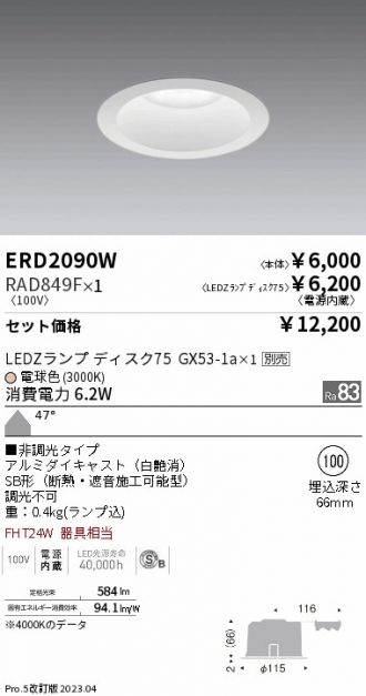 ベースダウンライト(高気密SB形) Φ100(ERD2090W+RAD849F)