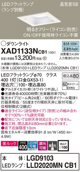 天井埋込型 LED(昼白色) ダウンライト 美ルック・浅型8H・高気密SB形・ビーム角24度・集光タイプ 調光タイプ(ライコン別売)/埋込穴□100 110Vダイクール電球60形1灯器具相当(LGD9103+LLD2020MNCB1)