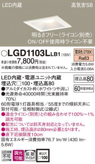 天井埋込型 LED(電球色) ダウンライト 浅型8H・高気密SB形・拡散タイプ(マイルド配光) 調光タイプ(ライコン別売)/埋込穴□100 白熱電球60形1灯器具相当