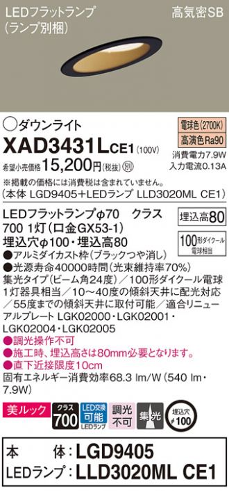 天井埋込型 LED(電球色) 傾斜天井用ダウンライト 美ルック・浅型8H・高気密SB形・ビーム角24度・集光タイプ 埋込穴φ100 110Vダイクール電球100形1灯器具相当(LGD9405+LLD3020MLCE1)