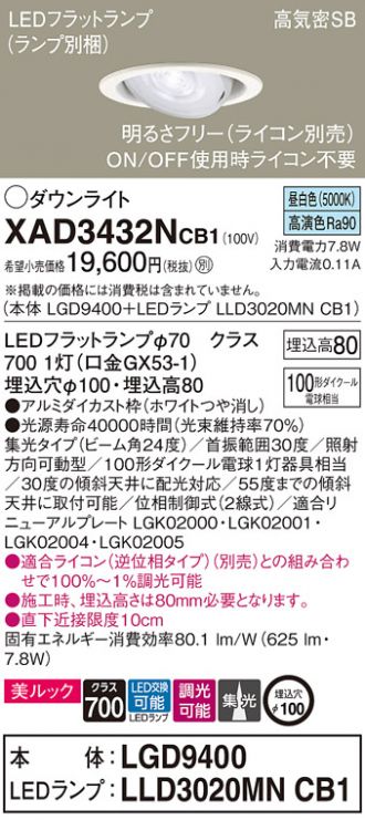 天井埋込型 LED(昼白色) ユニバーサルダウンライト 美ルック・浅型8H・高気密SB形・ビーム角24度・集光タイプ 調光タイプ(ライコン別売)/埋込穴φ100 110Vダイクール電球100形1灯器具相当(LGD9400+LLD3020MNCB1)
