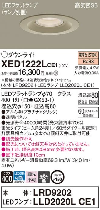 天井埋込型 LED(電球色) 軒下用ダウンライト 浅型8H・高気密SB形・ビーム角24度・集光タイプ 防湿型・防雨型/埋込穴φ150 パネル付型 110Vダイクール電球60形1灯器具相当(LRD9202+LLD2020LCE1)