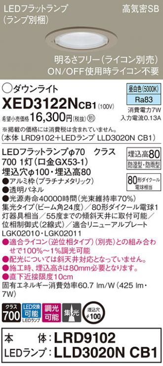 天井埋込型 LED(昼白色) 軒下用ダウンライト 浅型8H・高気密SB形・ビーム角24度・集光タイプ 防湿型・防雨型・調光タイプ(ライコン別売)/埋込穴φ100 パネル付型 110Vダイクール電球80形1灯器具相当(LRD9102+LLD3020NCB1)