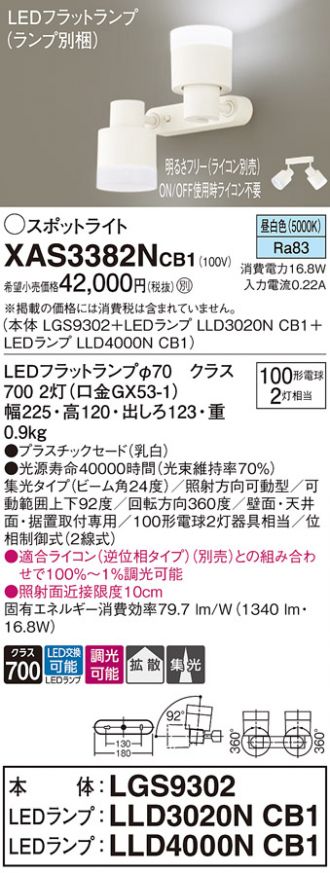 天井直付型・壁直付型・据置取付型 LED(昼白色) スポットライト プラスチックセードタイプ・ビーム角24度・集光タイプ・拡散タイプ 調光タイプ(ライコン別売) 白熱電球100形2灯器具相当(LGS9302+LLD3020NCB1+LLD4000NCB1)