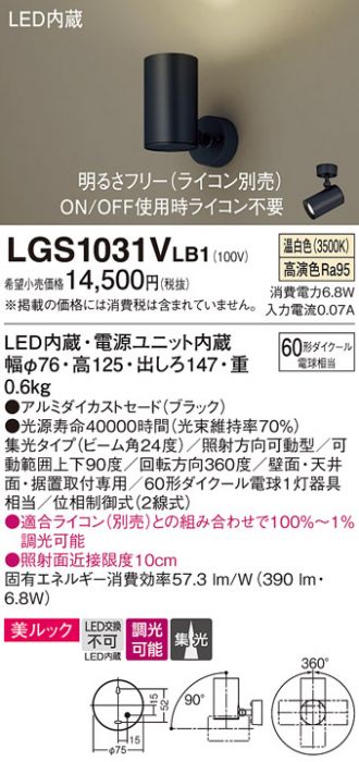 天井直付型・壁直付型・据置取付型 LED(温白色) スポットライト 美ルック・ビーム角24度・集光タイプ 調光タイプ(ライコン別売) 110Vダイクール電球60形1灯器具相当