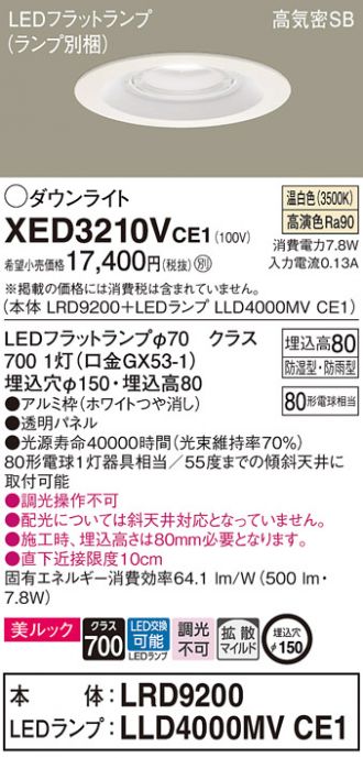 天井埋込型 LED(温白色) 軒下用ダウンライト・ポーチライト 美ルック・浅型8H・高気密SB形・拡散タイプ(マイルド配光) 防湿型・防雨型/埋込穴φ150 パネル付型 白熱電球80形1灯器具相当(LRD9200+LLD4000MVCE1)