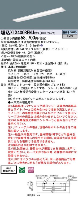 天井埋込型 40形 一体型LEDベースライト 連続調光型調光タイプ(ライコン別売) 下面開放型 Hf蛍光灯32形高出力型3灯器具相当/Hf蛍光灯63形定格出力型2灯器具相当 Hf蛍光灯32形高出力型/Hf蛍光灯63形定格出力型・10000 lm(NNLK41719J+NNL4000ENJRX9)