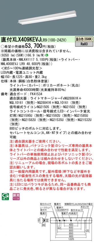 リニューアル用 天井直付型 40形 一体型LEDベースライト 連続調光型調光タイプ(ライコン別売) 反射笠付型 Hf蛍光灯32形高出力型3灯器具相当/Hf蛍光灯63形定格出力型2灯器具相当 Hf蛍光灯32形高出力型/Hf蛍光灯63形定格出力型・10000 lm(NNLK41117+NNL4000EVJLR9)