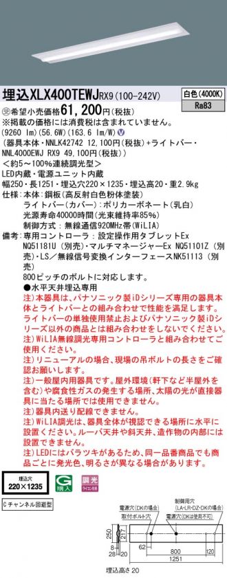 【代金引換不可】天井埋込型 40形 一体型LEDベースライト 連続調光型調光タイプ(ライコン別売) 下面開放型 Hf蛍光灯32形高出力型3灯器具相当/Hf蛍光灯63形定格出力型2灯器具相当 Hf蛍光灯32形高出力型/Hf蛍光灯63形定格出力型・10000 lm(NNLK42742+NNL4000EWJRX9)