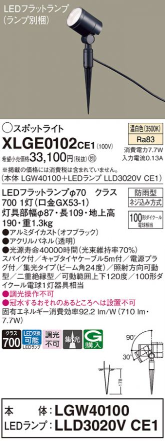 スパイク取付型 LED(温白色) エクステリア スポットライト ビーム角24度・集光タイプ 防雨型 パネル付型 110Vダイクール電球100形1灯器具相当(LGW40100+LLD3020VCE1)