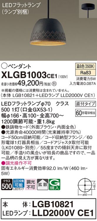 吊下型 LED(温白色) ペンダント 鉄鋳物セードタイプ・拡散タイプ・直付タイプ 白熱電球60形1灯器具相当(LGB10821+LLD2000VCE1)