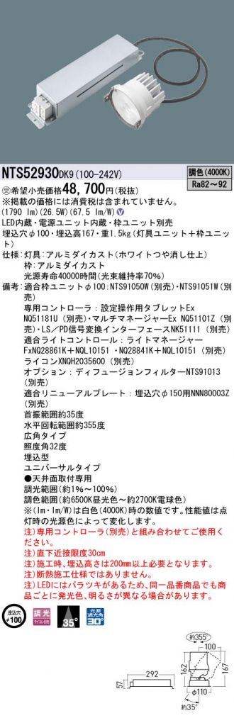◆天井埋込型、埋込穴φ100、ビーム角35度・広角タイプ・光源遮光角30度、φ100枠ユニットとの組合せ