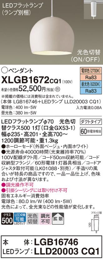 吊下型 LED(昼光色・電球色) ペンダント ホーローセードタイプ・拡散タイプ・ダクトタイプ 白熱電球60形1灯器具相当(LGB16746+LLD20003CQ1)