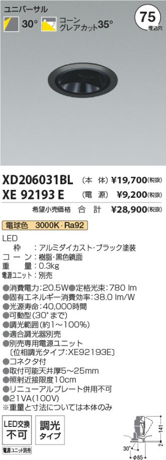 ユニバーサルダウンライト(XD206031BL+XE92193E)