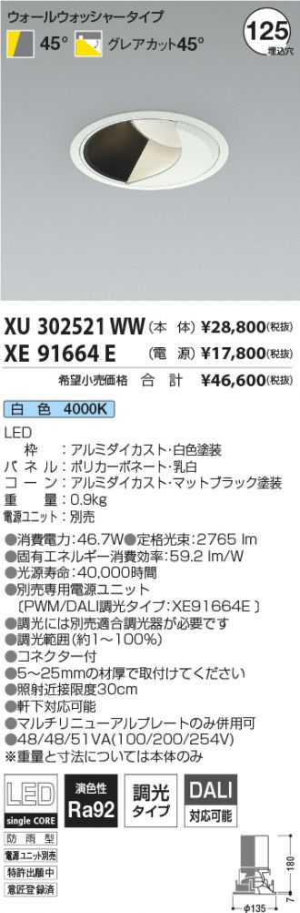 防雨型ウォールウォッシャーダウンライト(XU302521WW+XE91664E)