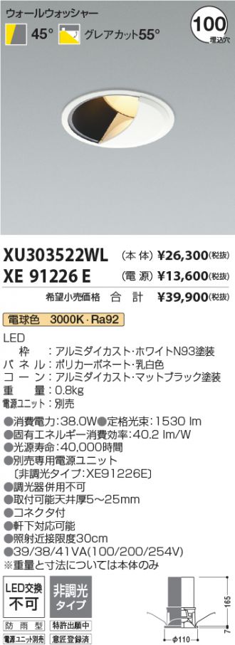 防雨型ウォールウォッシャーダウンライト(XU303522WL+XE91226E)