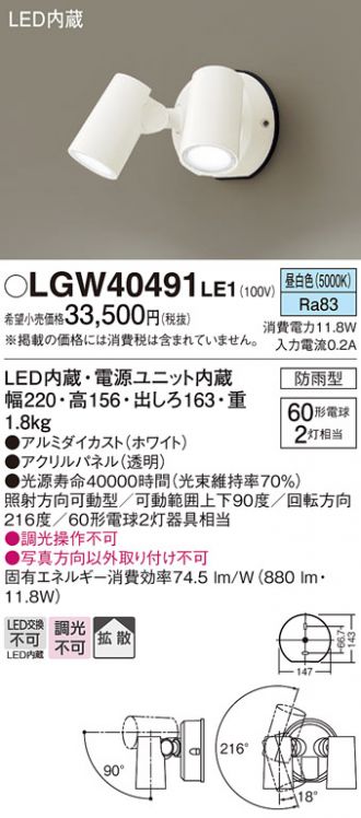 壁直付型 LED(昼白色) エクステリア スポットライト 拡散タイプ 防雨型 パネル付型 白熱電球60形2灯器具相当