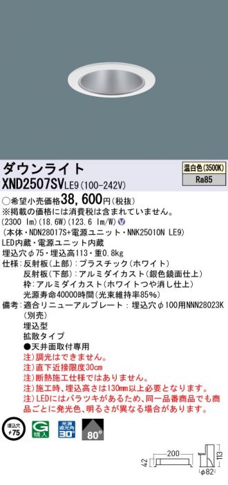 天井埋込型 LED(温白色) ダウンライト ビーム角80度・拡散タイプ・光源遮光角30度 埋込穴φ75 水銀灯100形1灯器具相当 LED 250形(NDN28017S+NNK25010NLE9)