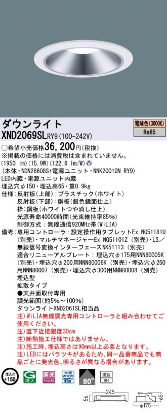 天井埋込型 LED(電球色) ダウンライト 浅型9H・ビーム角80度・拡散タイプ・光源遮光角15度 調光タイプ(ライコン別売)/埋込穴φ150 コンパクト形蛍光灯FHT42形1灯器具相当 LED 200形(NDN28608S+NNK20010NRY9)