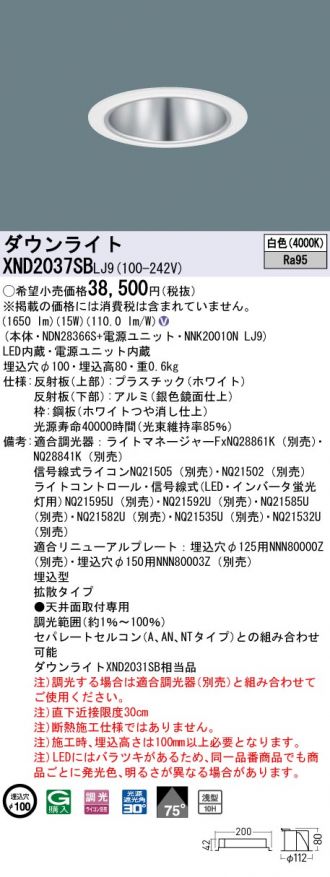 天井埋込型 LED(白色) ダウンライト 高演色タイプ・浅型10H・ビーム角75度・拡散タイプ・光源遮光角30度 調光タイプ(ライコン別売)/埋込穴φ100 コンパクト形蛍光灯FHT42形1灯器具相当 LED 200形(NDN28366S+NNK20010NLJ9)