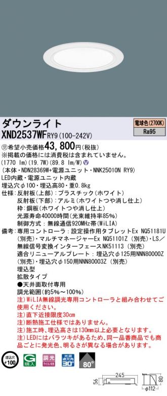 【代金引換不可】天井埋込型 LED(電球色) ダウンライト 高演色タイプ・ビーム角80度・拡散タイプ・光源遮光角30度 調光タイプ(ライコン別売)/埋込穴φ100 水銀灯100形1灯器具相当 LED 250形(NDN28369W+NNK25010NRY9)