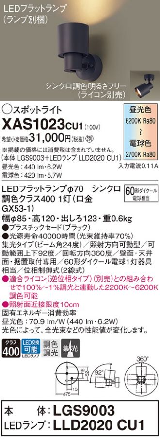 天井直付型・壁直付型・据置取付型 LED(調色) スポットライト プラスチックセードタイプ・ビーム角24度・集光タイプ LEDフラットランプ交換型・LEDフラットランプ交換型・調光タイプ(ライコン別売) 110Vダイクール電球60形1灯器具相当(LGS9003+LLD2020CU1)