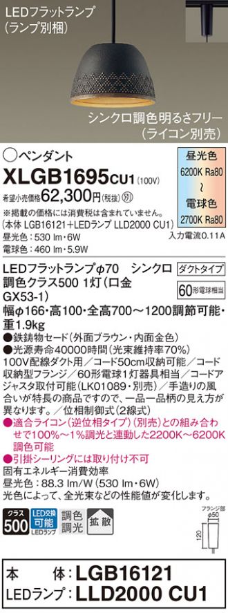吊下型 LED(調色) ペンダント 鉄鋳物セードタイプ・拡散タイプ・ダクトタイプ LEDフラットランプ交換型・調光タイプ(ライコン別売) 白熱電球60形1灯器具相当(LGB16121+LLD2000CU1)
