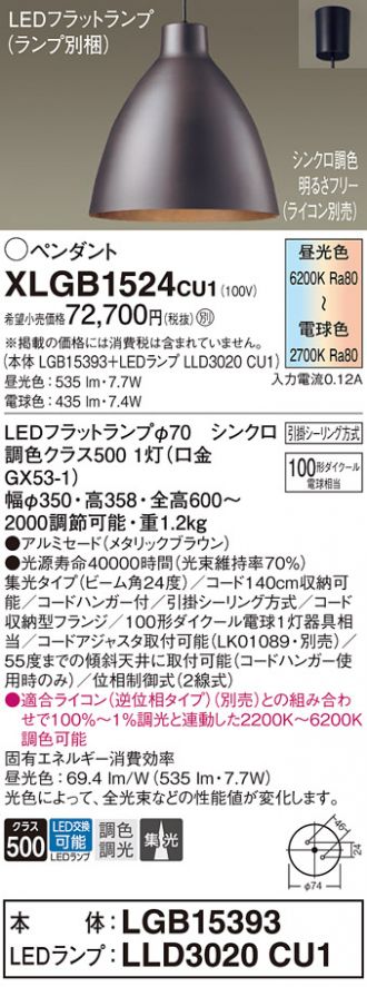 吊下型 LED(調色) ペンダント アルミセードタイプ・ビーム角24度・集光タイプ・引掛シーリング方式 LEDフラットランプ交換型・調光タイプ(ライコン別売) 110Vダイクール電球100形1灯器具相当(LGB15393+LLD3020CU1)
