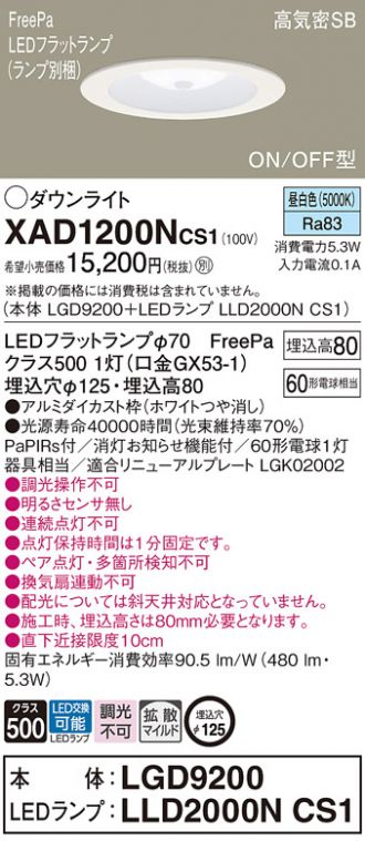 天井埋込型 LED(昼白色) ダウンライト 浅型8H・高気密SB形・拡散タイプ(マイルド配光) LEDフラットランプ交換型・FreePa・ON/OFF型/埋込穴φ125 白熱電球60形1灯器具相当(LGD9200+LLD2000NCS1)