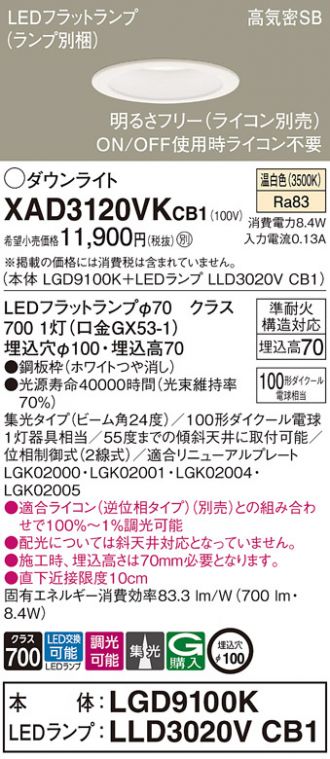 天井埋込型 LED(温白色) ダウンライト 浅型7H・高気密SB形・ビーム角24度・集光タイプ LEDフラットランプ交換型・調光タイプ(ライコン別売)/埋込穴φ100 110Vダイクール電球100形1灯器具相当(LGD9100K+LLD3020VCB1)