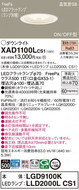 天井埋込型 LED(電球色) ダウンライト 浅型7H・高気密SB形・拡散タイプ(マイルド配光) LEDフラットランプ交換型・FreePa・ON/OFF型/埋込穴φ100 白熱電球60形1灯器具相当(LGD9100K+LLD2000LCS1)