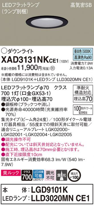 天井埋込型 LED(昼白色) ダウンライト 美ルック・浅型7H・高気密SB形・ビーム角24度・集光タイプ LEDフラットランプ交換型/埋込穴φ100 110Vダイクール電球100形1灯器具相当(LGD9101K+LLD3020MNCE1)