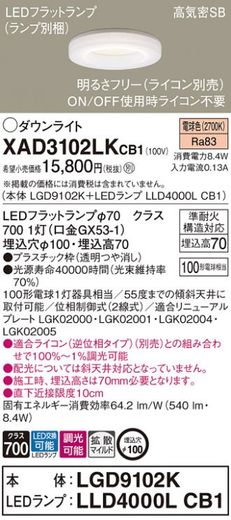天井埋込型 LED(電球色) ダウンライト 浅型7H・高気密SB形・拡散タイプ(マイルド配光) LEDフラットランプ交換型・調光タイプ(ライコン別売)/埋込穴φ100 白熱電球100形1灯器具相当(LGD9102K+LLD4000LCB1)