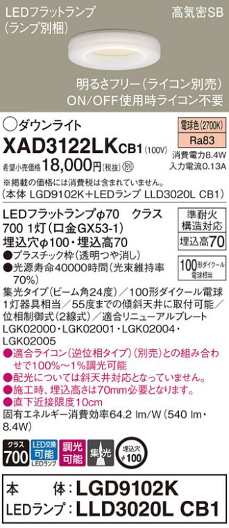 天井埋込型 LED(電球色) ダウンライト 浅型7H・高気密SB形・ビーム角24度・集光タイプ LEDフラットランプ交換型・調光タイプ(ライコン別売)/埋込穴φ100 110Vダイクール電球100形1灯器具相当(LGD9102K+LLD3020LCB1)